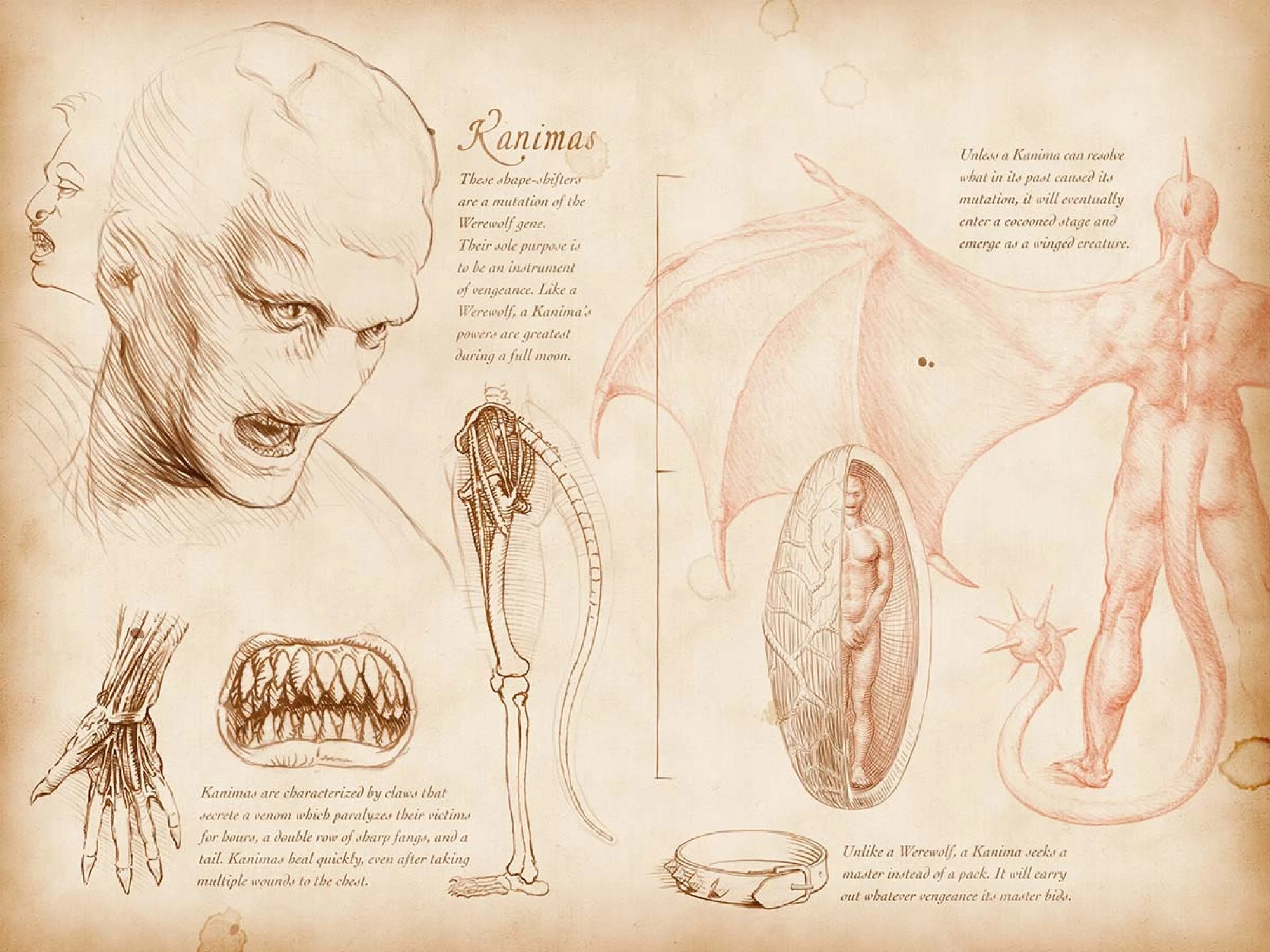 « Comme le loup, son pouvoir est plus grand à l'apogée de la Lune. Comme le loup, le Kanima est une créature sociale, mais là où le loup cherche une meute le Kanima cherche un "Maitre" (faussement traduit précédemment par "Ami"). Le Kanima, une arme de vengeance, est utilisé pour effectuer la soumission de son maître. Le Kanima était autrefois utilisé par un prêtre sud américain qui prit sur lui de débarrasser son village de tous les meurtriers. La liaison entre maître et serviteur progressa jusqu'à ce que la volonté du maître soit devenue celle du Kanima celui que le prêtre jugé indigne, le Kanima a servi sa vengeance. Le Kanima est une mutation dans le gène du loup-garou qui ne peut pas se transformer entièrement jusqu'à ce qu'il résolve quelque chose de son passé. »