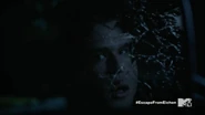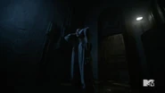 Still blocked by the Mountain Ash barrier, Scott grabs one of the unconscious Eichen House guards’ radios and, pretending to be a guard (Unit 9), asks for a status update on the closed unit. The voice on the other end describes it as a war zone. Scott tries to ask about Lydia but the voice becomes suspicious and Scott crushes the radio. Scott decides to go find Meredith in hopes of finding a way through the barrier.