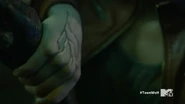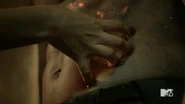 Corey isn’t healing. Malia speculates that it’s too much for him or perhaps his pain is blocking him. She offers to take Corey’s pain to help him heal if Josh will absorb Kira’s extra electricity. They don’t trust each other so decide to do it at the same time. She grabs Corey’s burnt arm and the veins in her hands begin to blacken as she absorbs the boy’s pain. Josh grabs Kira and his body is surrounded by purple lightning as he roars.