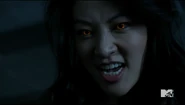 Scott and Stiles arrive at Scott’s house to find Hayden has locked herself in the bathroom. Liam apparently brought her to the McCall House after their escape from the Dread Doctors on the road. Scott can hear her heartbeat and says she is freaked out. Stiles tries his luck getting her to open the door saying that her sister works with his dad and they just want to help. Scott says he’s there to help but will break the door down if he has to. She opens the door, her eyes are glowing yellow. She has fangs and claws.